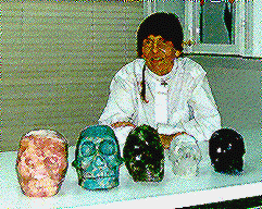 Joke has a vision of obtaining twelve different skulls. Since her acquisition of "ET" she also purchased: Shui Ting Er - an amazonite skull discovered in Mongolia; The Luv Skull - a Rose Quartz Skull discovered near Luv Russia in a mound containing artifacts from the Scylanthians and lastly, the Jesuit Skull, which is purported connected to the Jesuits and possibly St. Francis of Assisi, this last one is a third of size human skull that is made from clear quartz. It has been very interesting working with Joke, she is a dynamic individual who loves living on the edge. In November/December of 1995, we traveled with Joke to Australia to share two of the four skulls she has purchased. At our booth at the Body-Mind-Spirit Festival, between 150-200 people had a chance to experience these two crystal skulls. To the best of our knowledge this was the first time publicly (always leave room for the unexpected I say) Australians had an opportunity to experience an ancient Crystal Skull. I would guess that approximately 95% of the people who visited us at the booth were able to feel an energy from the skulls. One person even told me they had a profound dream the night following the contact with the skulls.